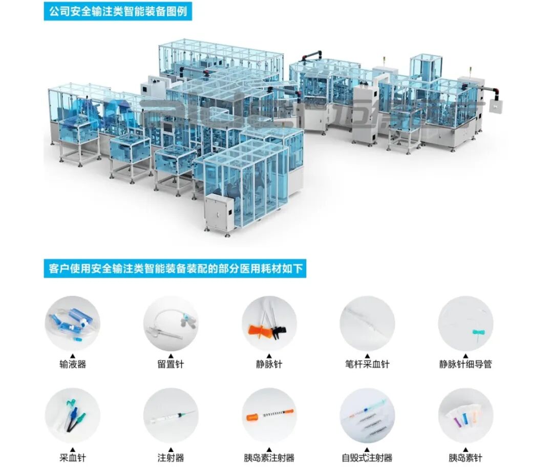 公司的主要产品包括安全输注类、血液净化类两大类设备。安全输注类设备主要用于安全自毁式注射器、安全注射针、留置针、胰岛素注射器等医用耗材的组装、检测、包装等环节及帮助客户解决生产工艺难题。