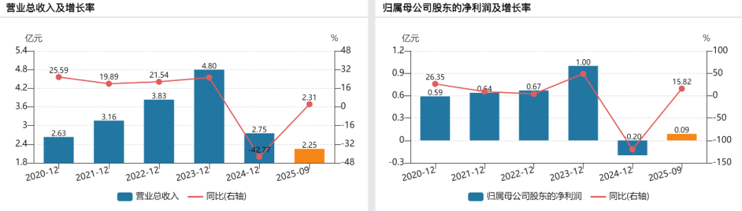 最新披露的2025年三季度业绩报告显示,公司前三季度实现营业收入2.25亿元,同比仅微增2.3%;归母净利润883.7万元,同比增长16%,扣非后净亏损127.9万元。