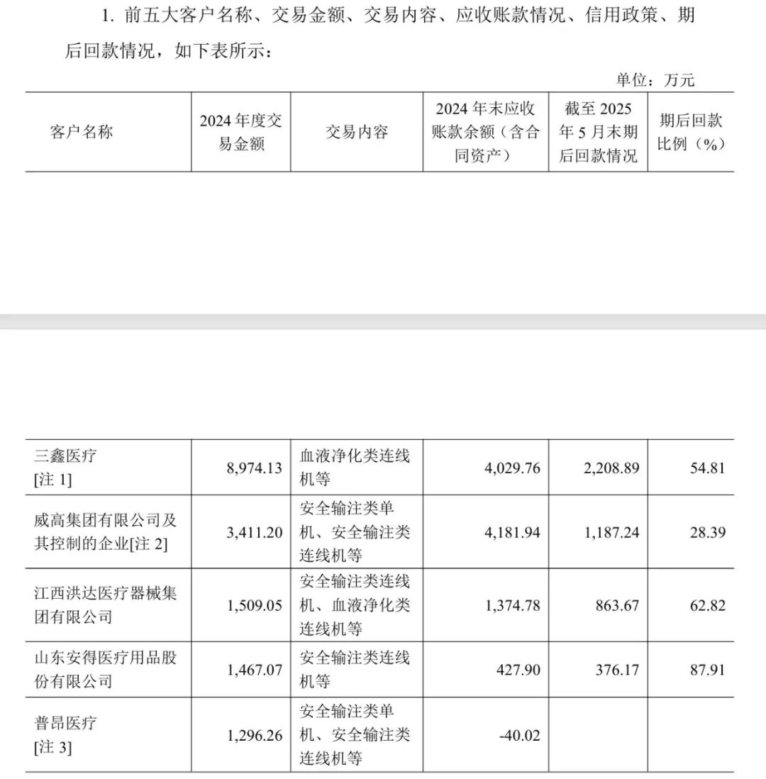 截至2024年末,公司的应收账款1.28亿元,占当期营收的46.5%,前五大欠款客户主要是威高集团等公司。